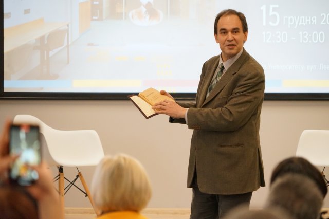 Під час презентації з вітальним словом виступив виконувач обов’язків ректора, заслужений працівник освіти України Олександр Турунцев: «Оновлена бібліотека – це серце університетського життя. Це простір, у якому знання стають живим процесом, формується відповідальне мислення, відбувається діалог і народжуються ідеї, здатні змінювати суспільство». Він передав до фондів бібліотеки Святе Євангеліє від Матвія – як символ духовної традиції, культурної тяглості та ціннісних орієнтирів.