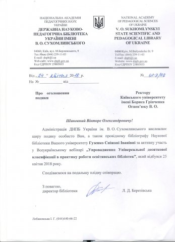 25 квітня 2018 р. відбувся Всеукраїнський вебінар "Упровадження Універсальної десяткової класифікації в практику роботи освітянських бібліотек”, який провела Державна науково-педагогічна бібліотека України імені В. О. Сухомлинського спільно з ДНУ "Інститут модернізації змісту освіти” Міністерства освіти і науки України за сприяння Microsoft.