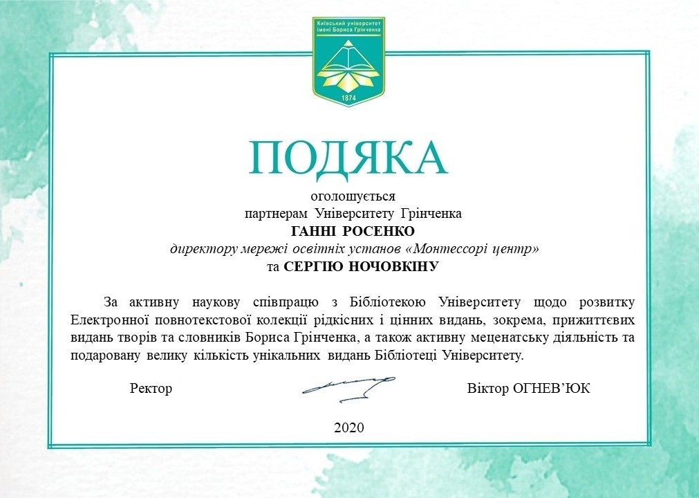 За активну наукову співпрацю з Бібліотекою Університету щодо розвитку Електронної повнотекстової колекції рідкісних і цінних видань, зокрема, прижиттєвих видань творів та словників Бориса Грінченка, а також активну меценатську діяльність та подаровану велику кількість унікальних видань Бібліотеці Університету.