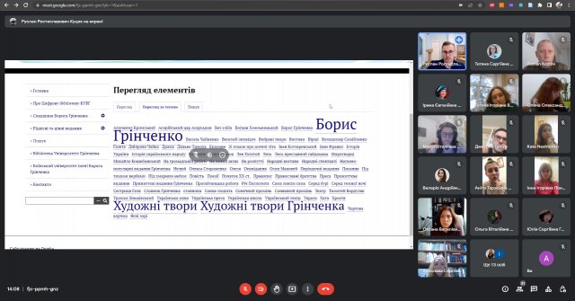 Директор бібліотеки Тетяна Опришко розповіла про шлях подання грантової заявки, вимоги експертів і покладені зусилля, щоб їм відповідати. Професор кафедри української літератури, компаративістики і грінченкознавства Роман Козлов наголосив на вагомості проєкту для сучасної філології, а також кожного українця, бо читати тексти без радянських перекручень і цензурних втручань – не лише шанс наблизитися до авторського задуму, зрозуміти митця, а й мати у світовій літературній колекції літературний факт, а не його підробку. Молодший науковий співробітник бібліотеки Руслан Куцик продемонстрував колекцію рідкісних та цінних видань XIX – початку XX століть, оцифровані видання художніх творів Бориса Грінченка, розповів про можливості повнотекстового пошуку. Професор кафедри Тетяна Вірченко розповіла про джерела біографічної інформації, які мають бути представлені в цифровій бібліотеці, адже це інструмент для біографістів. Окрім того, цифрова бібліотека – це унікальна можливість відстежити всі зміни в текстах і зрозуміти семантичні зрушення, якщо твір з часом зазнавав текстуальних змін. Роман Козлов, демонструючи листи Бориса Грінченка, запропонував присутнім насолодитися відмінністю почерку патрона Університету залежно від емоційного стану. Звичайно, не обійшлося без нових мрій, але про них лише тоді, коли вони стануть частиною реальності!