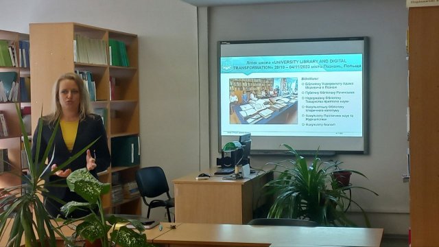 6 листопада 2023 року у стінах читальної зали бібліотеки директорка бібліотеки Тетяни ОПРИШКО прозвітувалася на засіданні ради бібліотеки про участь у літній школі «UNIVERSITY LIBRARY AND DIGITAL TRANSFORMATION», що проходила з 29 жовтня по 04 листопада 2023 року у м. Познань (Польща).