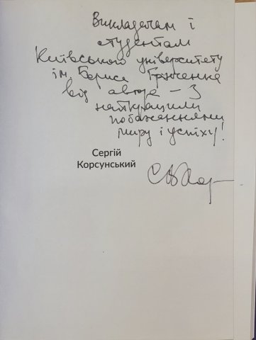 Надзвичайний і Повноважний Посол України в Японії, заслужений економіст України, доктор фізико-математичних наук, запрошений професор Університету Кобе-Ґакуїн (Японія), почесний професор Київського університету імені Бориса Грінченка, дипломат, письменник і філософ Сергій Володимирович Корсунський подарував академічній спільноті Університету Грінченка свою книгу «Як нації відновлюються: досвід Східної Азії» з найкращими побажаннями миру й успіху.