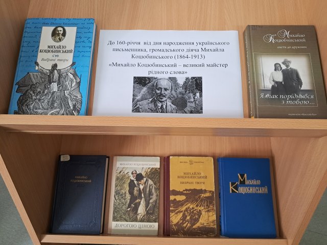 До 160-річчя від дня народження українського письменника, громадського діяча Михайла Коцюбинського (1864-1913) «Михайло Коцюбинський – великий майстер рідного слова». В читальній залі бібліотеки Головного корпусу по вул. Л. Лук’яненка, 13-б представлено виставку, що знайомить відвідувачів зі сторінками життя і творчості видатного письменника.