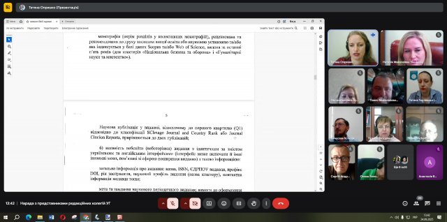 24 вересня 2025 року відбулася нарада головних редакторів та/або відповідальних секретарів фахових наукових журналів Університету для обговорення проєкту Порядку формування Переліку наукових фахових видань України і завдань, що стоять перед редколегіями журналів університету, пов’язаних з оновленням процесу формування Переліку наукових фахових видань.
